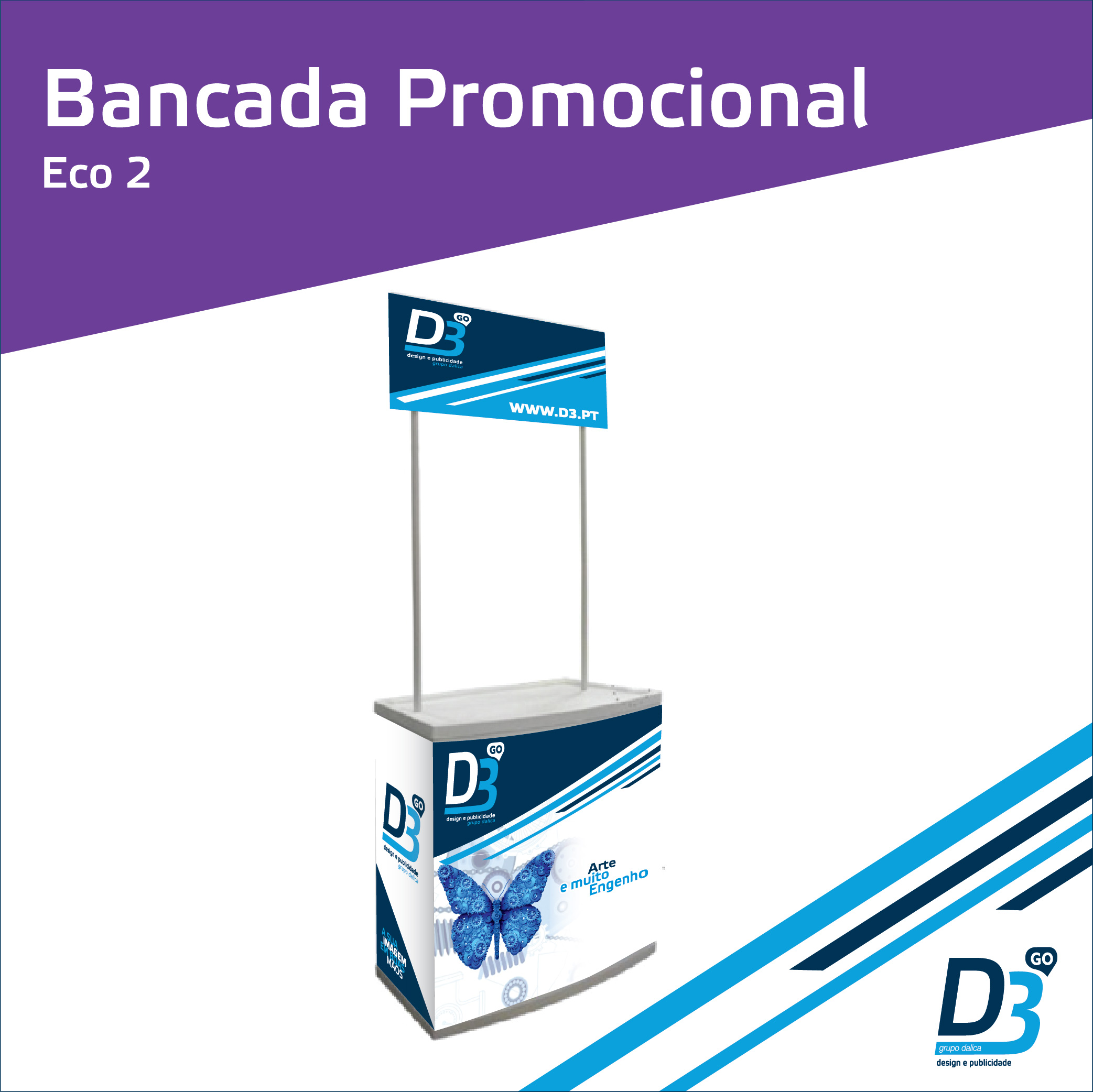 Bancada promocional, com tampo e prateleira em plástico. Com espaço para imagem de promoção no balcão (frente e laterais) e bandeirola superior. Fácil montagem e desmontagem, permitindo que seja simples deslocar este material de local para local. Expositor muito robusto e estável. Ideal para feiras ou promoção de rua. Para mais informações, contactar comercial@d3.pt ou 934982324.